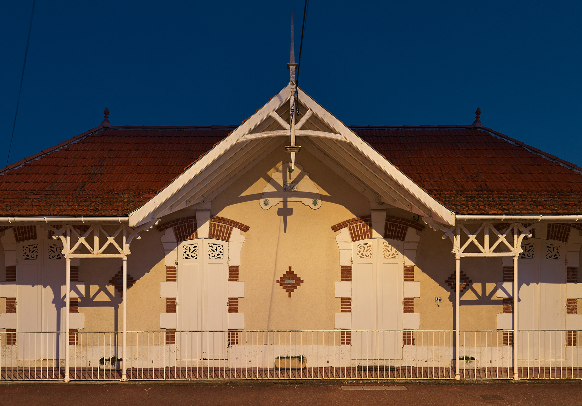 J’ai entrepris de photographier à la tombée de la nuit quelques villas traditionnelles arcachonnaises, des plus imposantes aux plus modestes. C’est à cette heure entre chien et loup que la magie de la lumière opère. Alors que le jour décline, l’obscurité ambiante met en valeur les maisons dont la clarté relative semble émaner d’elles comme si elles restituaient une partie de la lumière accumulée durant la journée. Il en résulte des contrastes et une saturation des couleurs étonnants. La lumière de l’éclairage public en se mêlant à la lumière naturelle donne aux villas un air mystérieux et théâtral. Elles deviennent surréalistes sous cette exposition et s’apparentent un peu à un décor de cinéma.